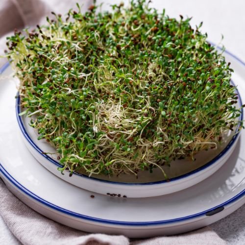 Microgreens de alfalfa, ligeros y perfectos para acompañar sándwiches o wraps.